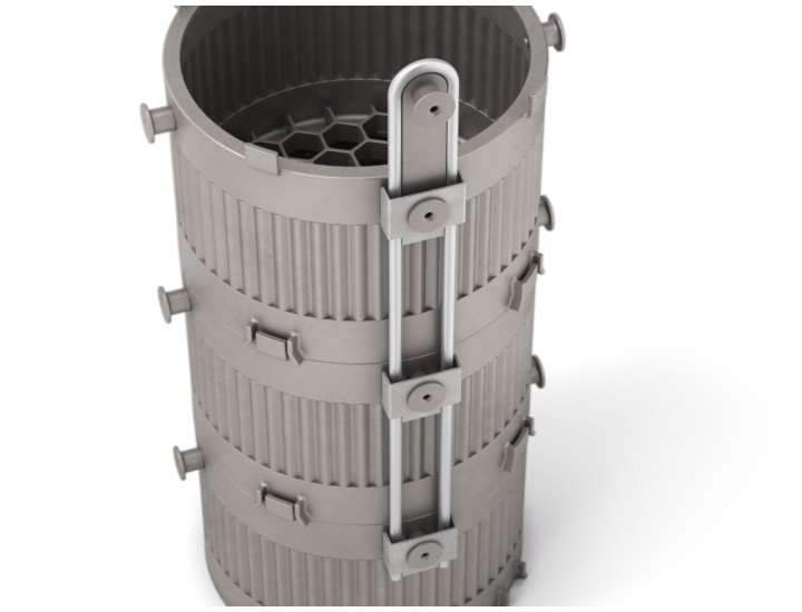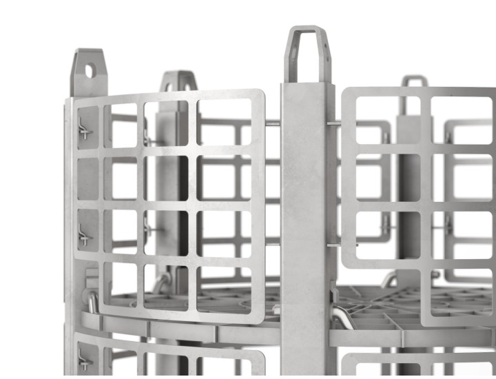 Integrated Cooling and Orientation Systems: Certain circular baskets are equipped with water cooling systems to maintain an optimal temperature during material transportation and treatment. Additionally, they feature orientation systems to ensure that latches and pin blocks are always in the correct position, facilitating assembly and handling.